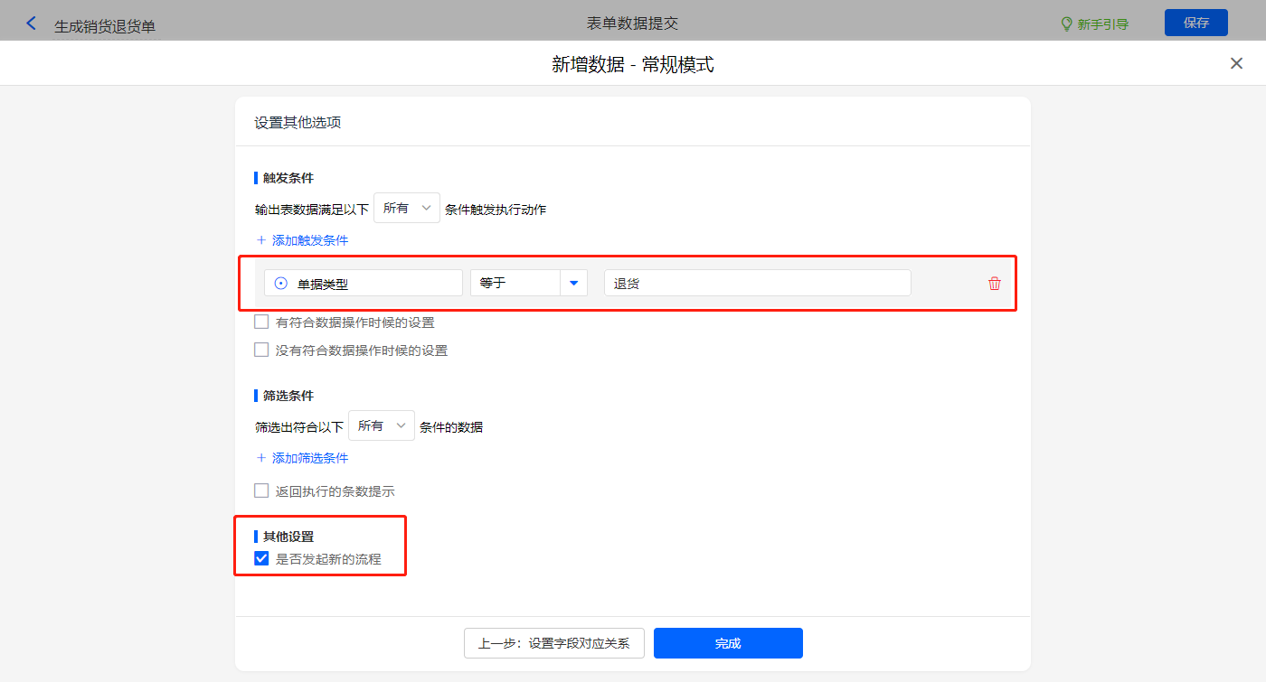 其他设置触发条件为【单据类型】字段等于退货,并设置发起新流程,设置好点击【完成】并保存该数据助手;
