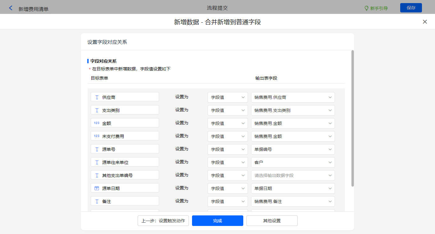 新增费用清单的数据助手,新增新增数据的执行动作,选择目标表单【费用清单】,选择对应字段,设置好点击【完成】并保存该数据助手;