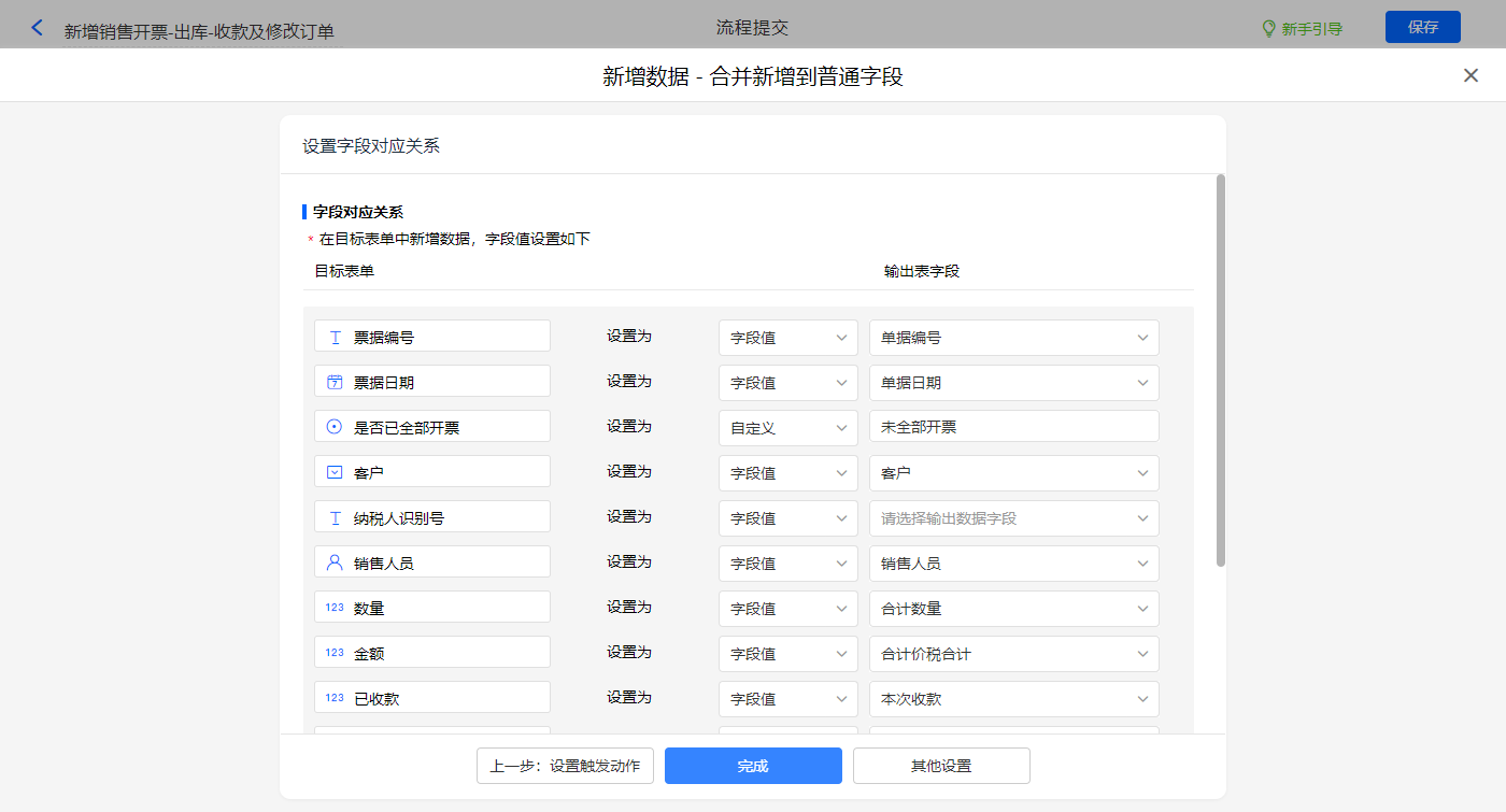 新增销售开票-出库-收款及修改订单的数据助手,有四个执行动;新增新增数据的执行动作,选择目标表单【销售开票】,选择对应字段,设置好点击【完成】并保存该数据助手;