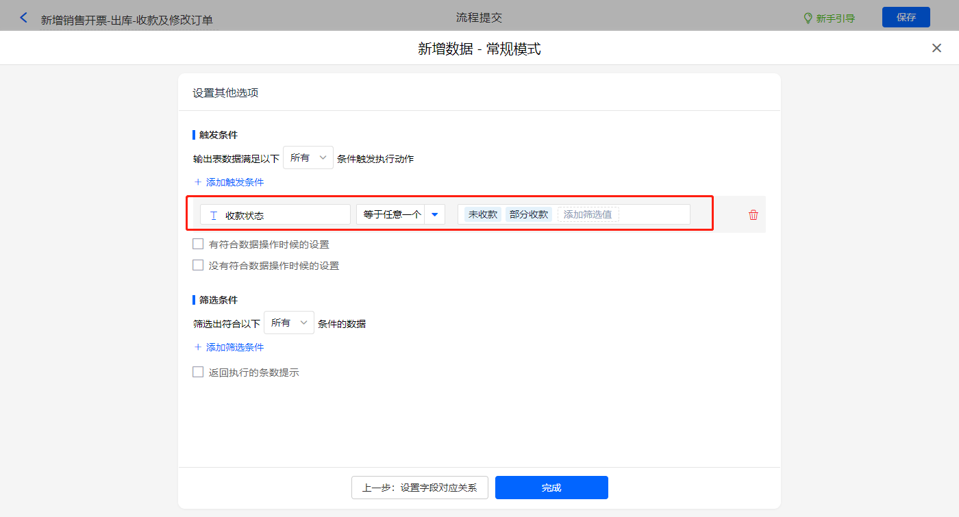 其他设置触发条件为【收款状态】字段等于未收款或部分收款,设置好点击【完成】并保存该数据助手;