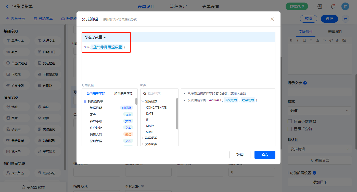 1)【退货明细.可用库存】、【退货明细.销售单价】、【退货明细.含税单价】、【退货明细.折扣额】、【退货明细.金额】、【退货明细.税率(%)】、【退货明细.税额】、【退货明细.价税合计】、【退货明细.价税合计】、【合计数量】、【合计折扣额】、【合计金额】、【合计税额】、【合计价税合计】、【优惠金额】、【优惠后金额】、【金额大写】、【商品统计】、【总销售费用】以上字段如2.3设置公式; 选择【可退总数量】字段,设置默认值为公式编辑,如图设置公式;