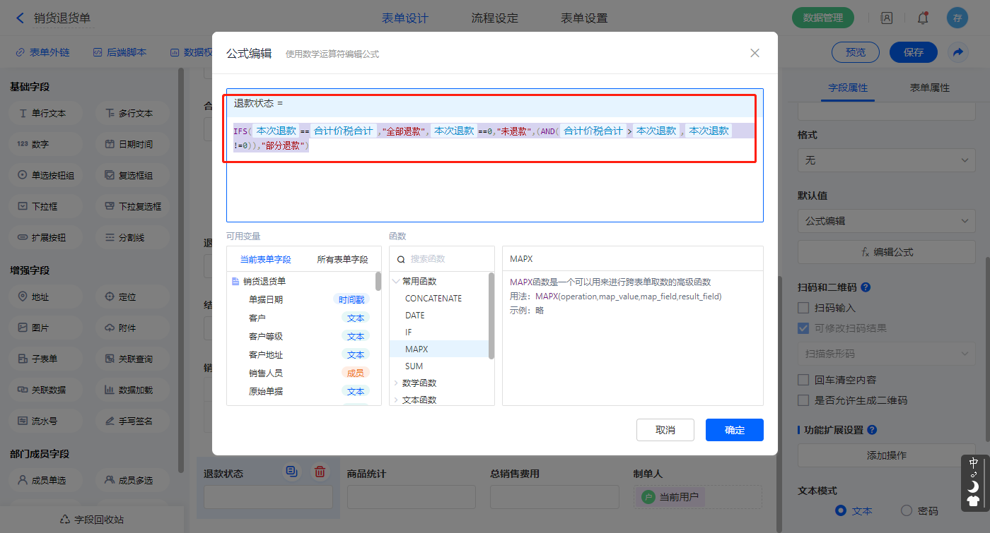 选择【退款状态】字段,设置默认值为公式编辑,设置公式:“IFS(本次退款合计价税合计,"全部退款",本次退款0,"未退款",(AND(合计价税合计>本次退款,本次退款!=0)),"部分退款")”;