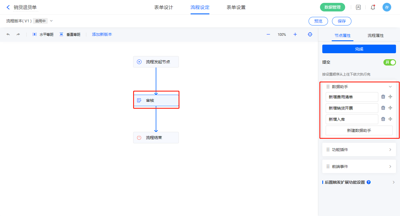 3)该表单是流程表单,设置流程节点审核,该节点属性的节点权限提交设置三条数据助手,分别名称为新增费用清单、新增销货开票、新增入库;