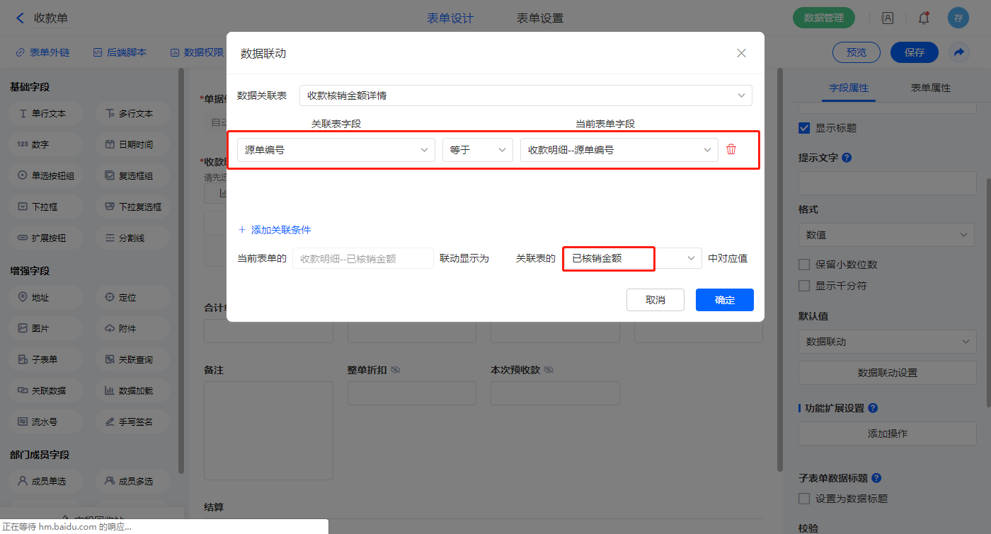 1)选中【收款明细.已核销金额】字段,设置默认值为数据联动,设置联动条件及联动字段;