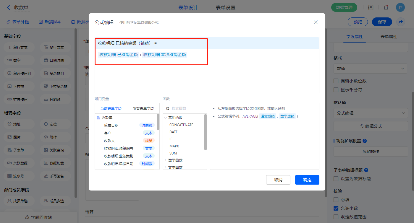 选择【收款明细.已核销金额(辅助)】字段,设置默认值为公式编辑,如图设置公式