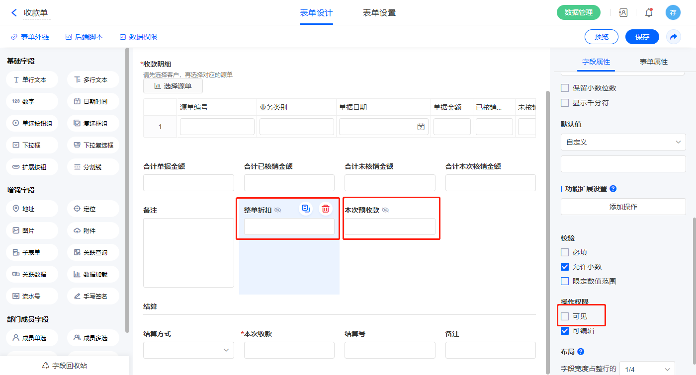 3)【整单折扣】、【本次预收款】两个字段设置不可见;