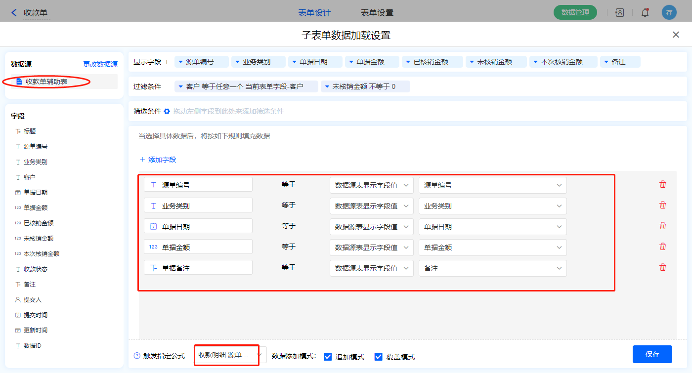 4)【收款明细】子表单字段,开启数据加载,数据源为【收款单辅助表】,添加过滤条件及设置赋值字段,触发公式为【源单编号】字段;