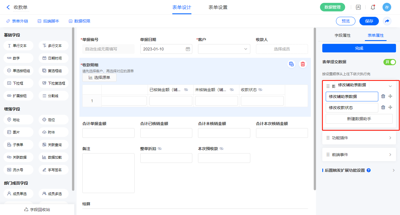 5)表单提交数据新增两条数据助手,名称分为修改辅助表数据、修改收款状态见;