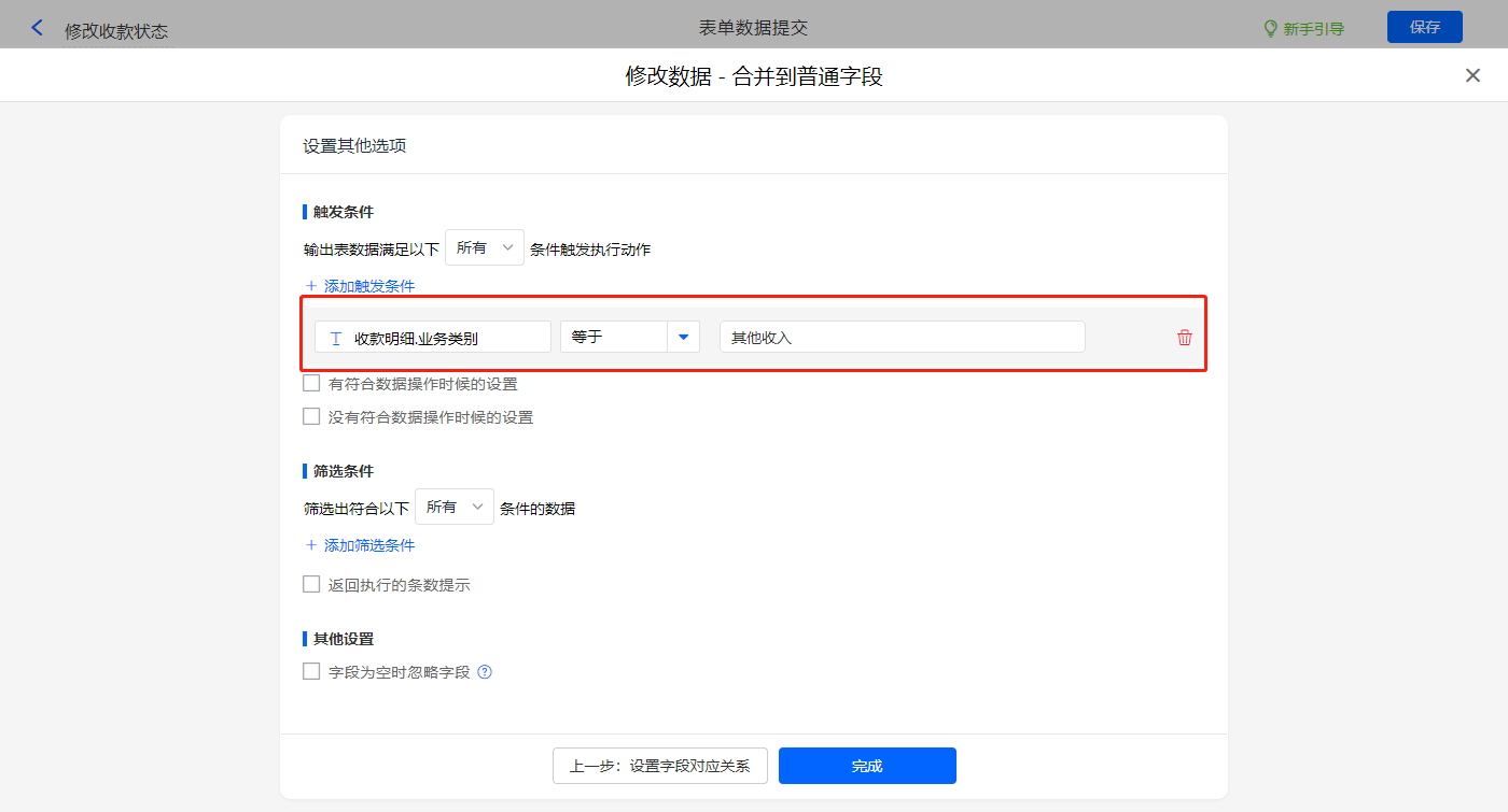 其他设置触发条件为【收款明细.业务类别】等于其他收入,设置好点击【完成】并保存该数据助手;