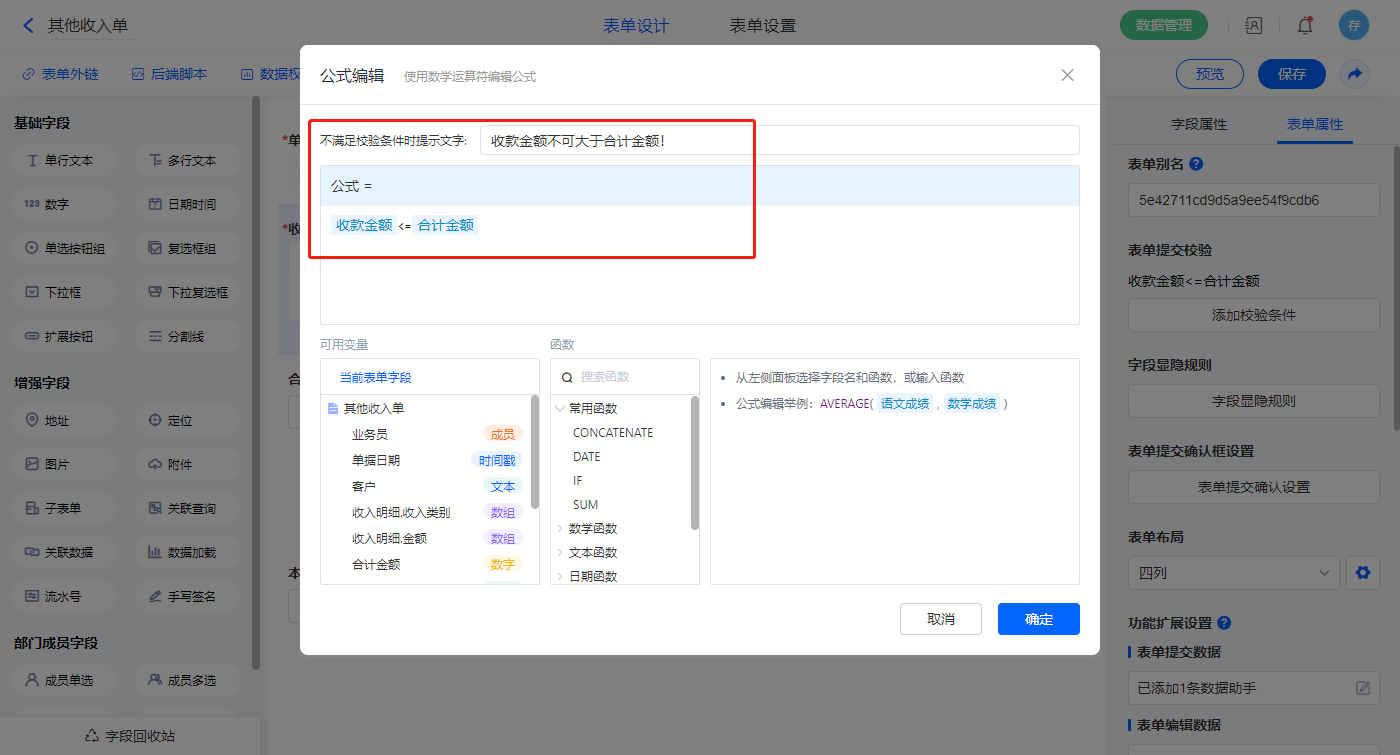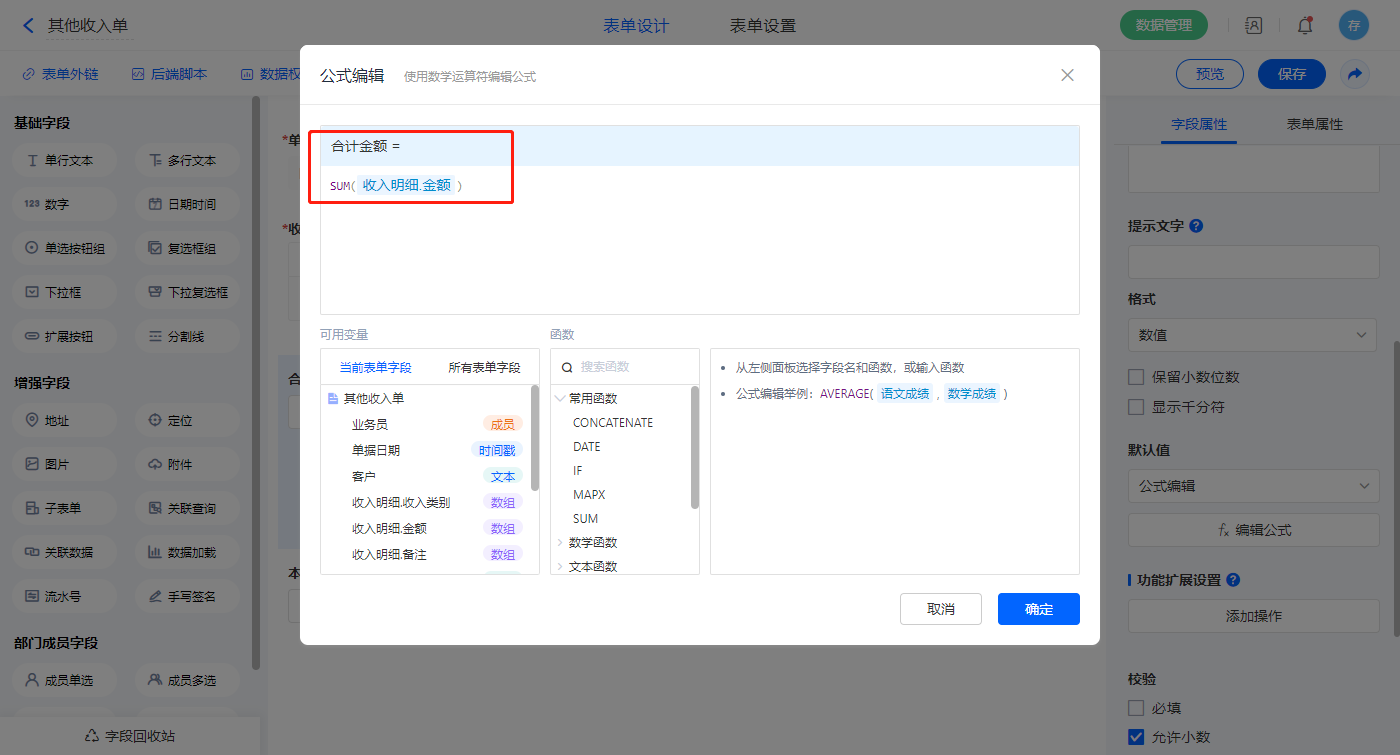 【收款金额】字段默认值设置为公式编辑,如图设置公式;