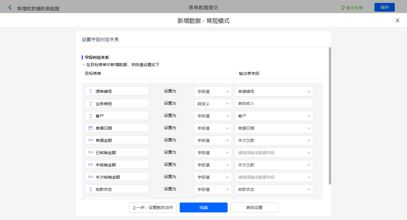 新增新增数据的执行动作,选择目标表单【收款单辅助表】,选择对应字段,设置好点击【完成】并保存该数据助手;