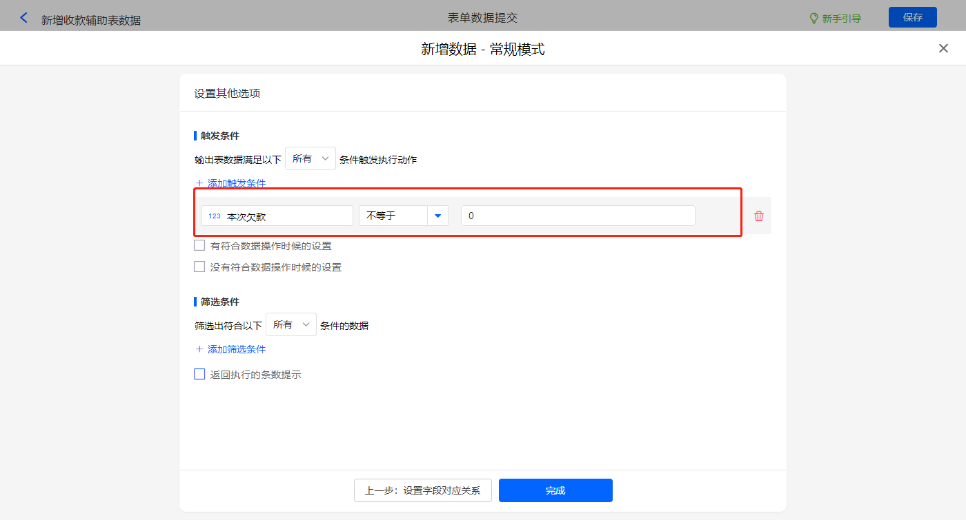 其他设置触发条件为【本次欠款】字段不等于0,设置好点击【完成】并保存该数据助手;