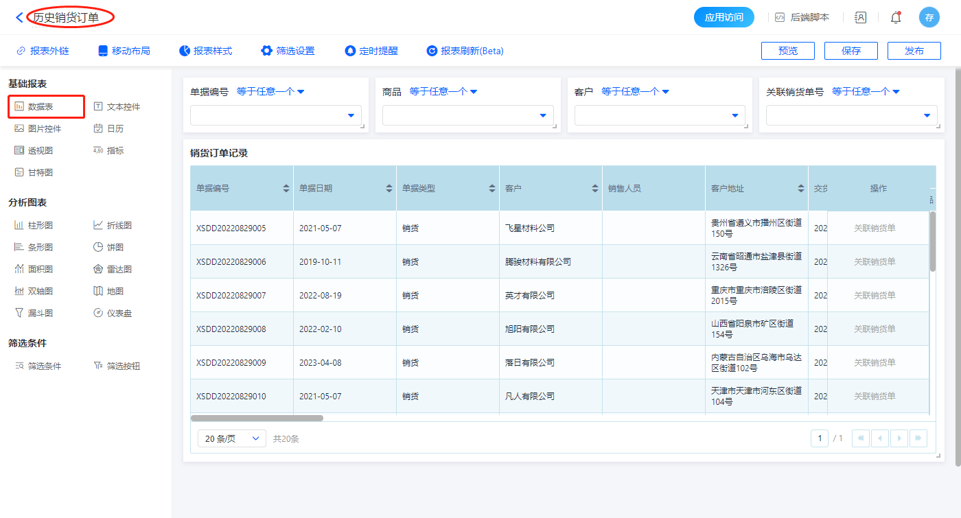 1)新增【历史销货单】报表,用基础报表【数据表】展示数据源为表单【销货单】的数据;
