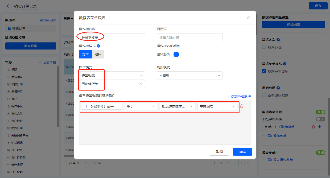 【关联销货单】的菜单栏,操作模式设置为弹出报表【历史销货单】;