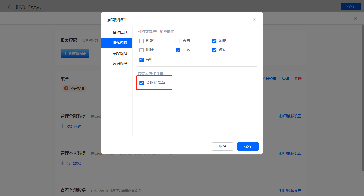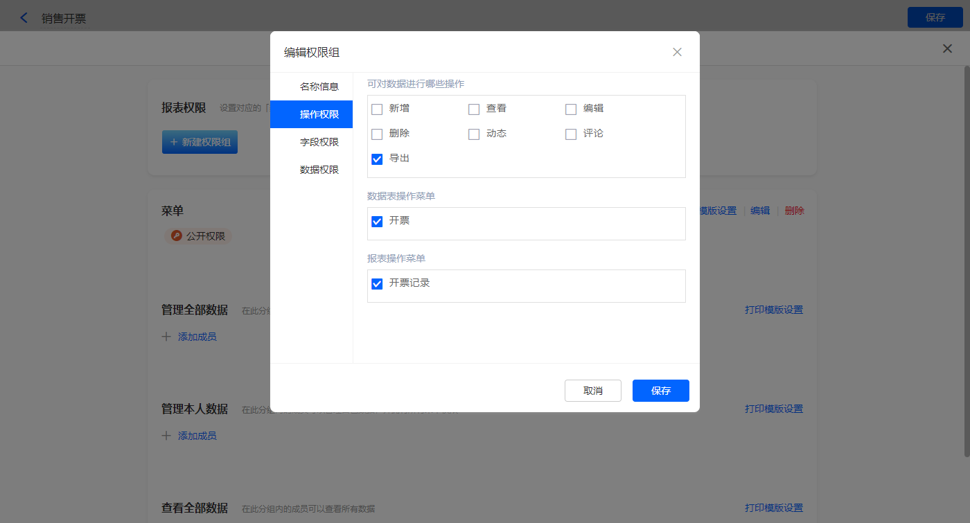 3)设置报表的权限,填入权限组名称,选择可操作的数据表菜单,点击【保存】;