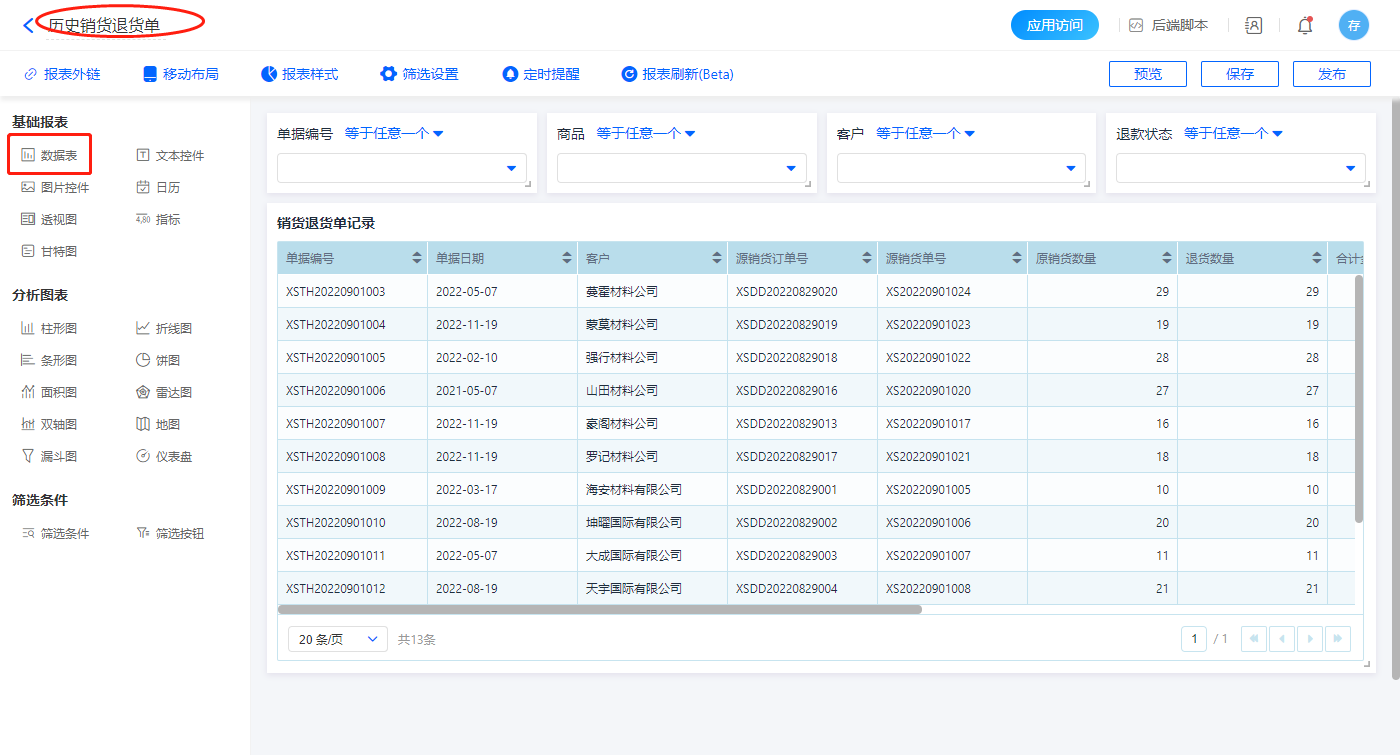 1)新增【历史销货退货单】报表,用基础报表【数据表】展示数据源为表单【销货退货单】的数据;