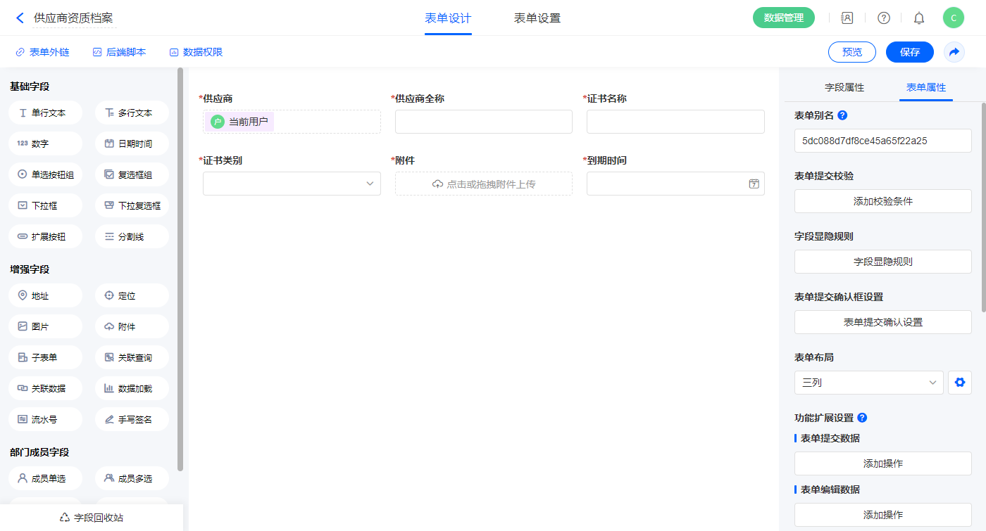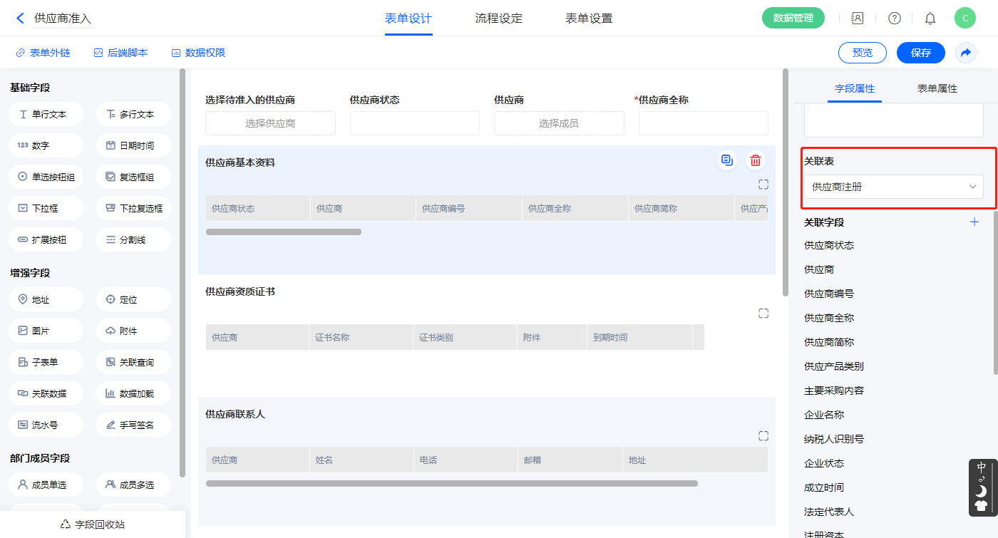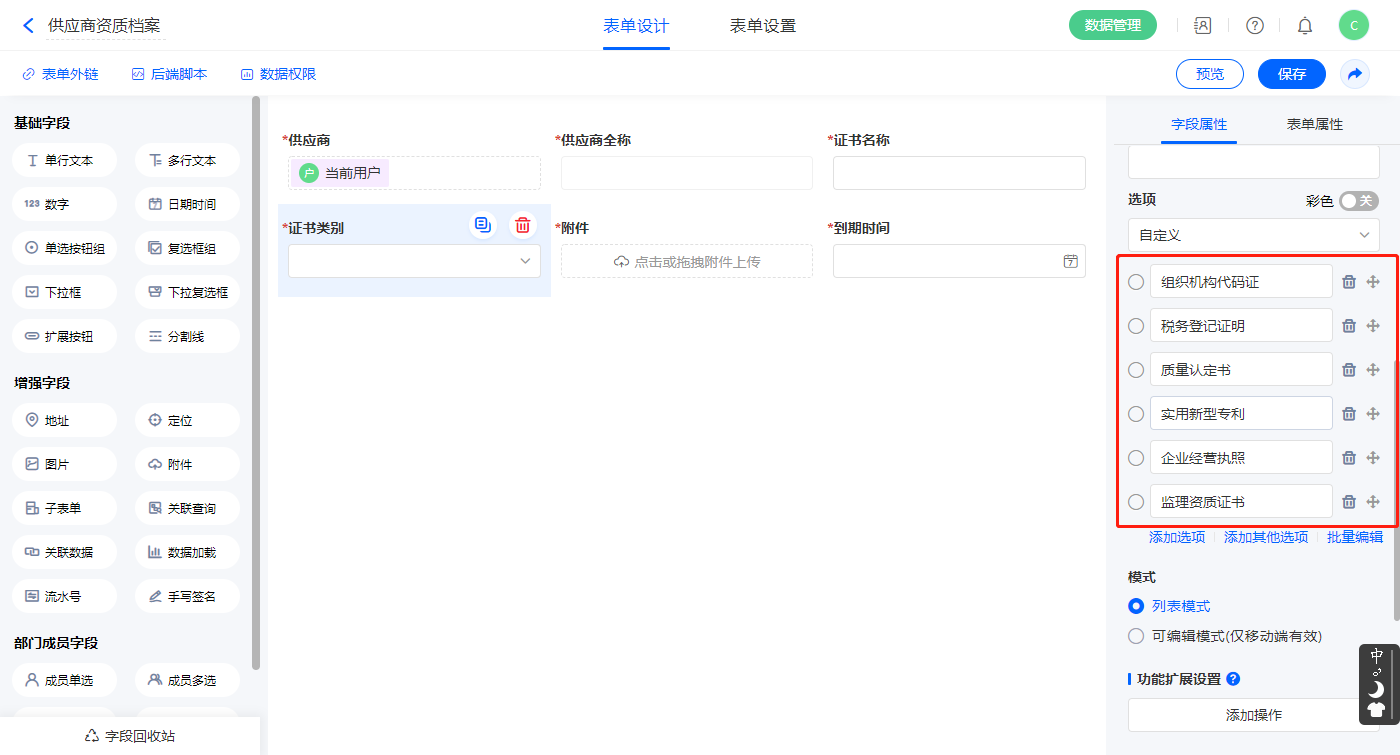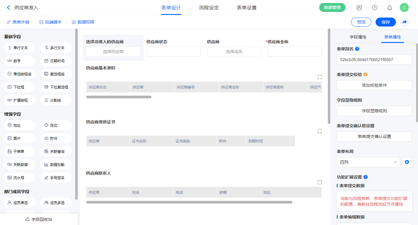 2.4、表单【供应商资质档案】字段及表单属性设置