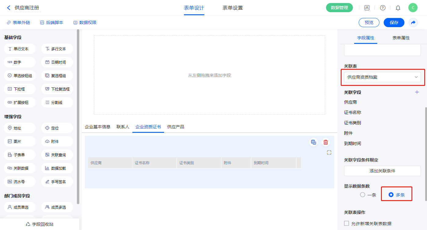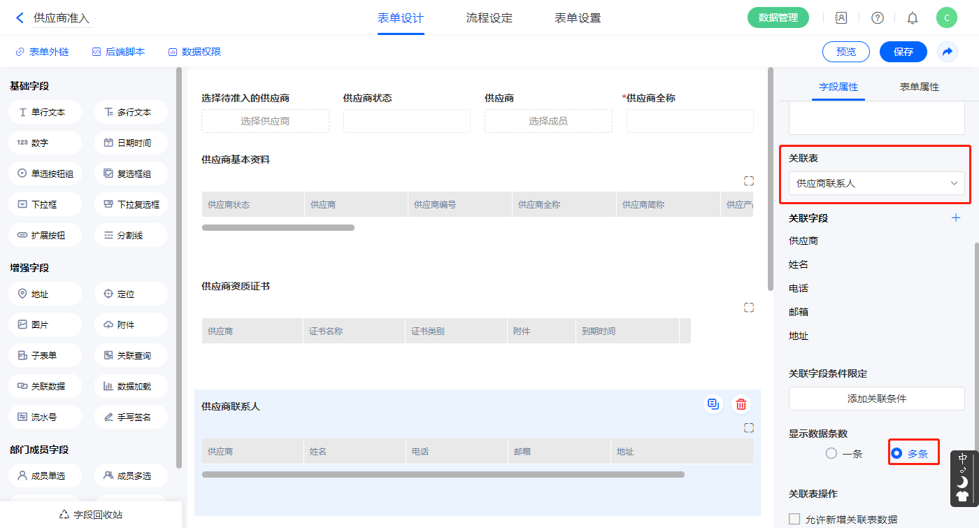 2)【供应商基本资料】关联查询字段,设置关联表为【供应商注册】并如图选择关联字段,设置显示数据条数为多条,并设置关联条件为【供应商】字段;