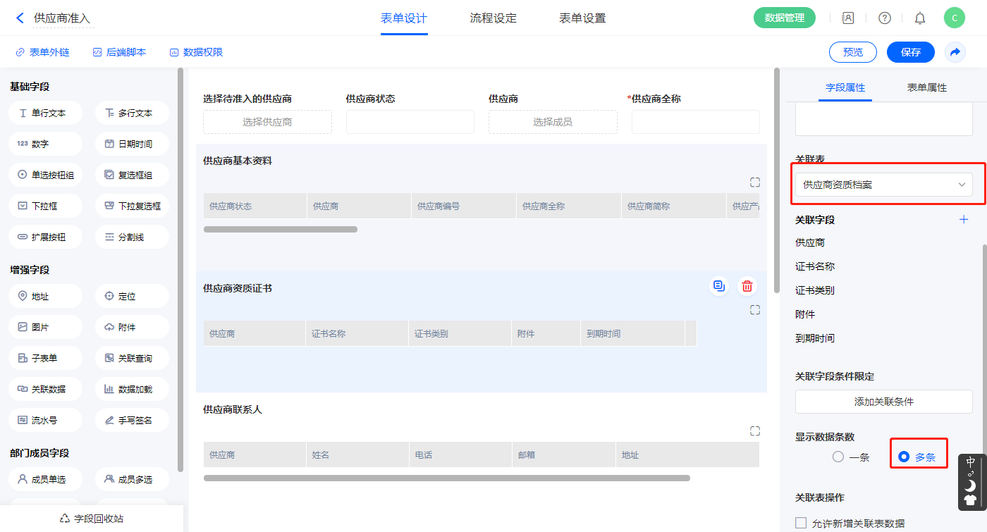【供应商资质证书】关联查询字段,设置关联表为【供应商资质档案】并如图选择关联字段,设置显示数据条数为多条,并设置关联条件为【供应商】字段;