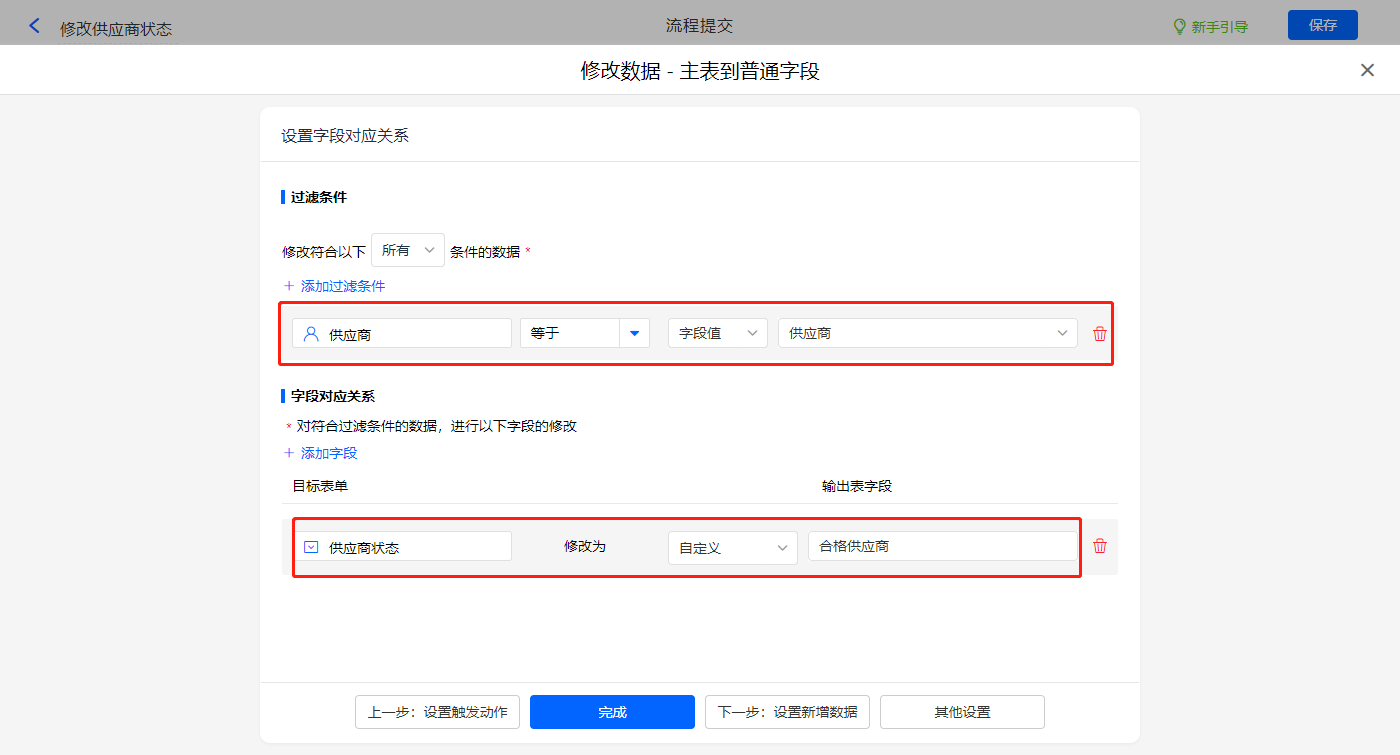 其他设置触发条件为【是否同意成为合格供应商?】字段等于同意,设置好点击【完成】并保存该数据助手;