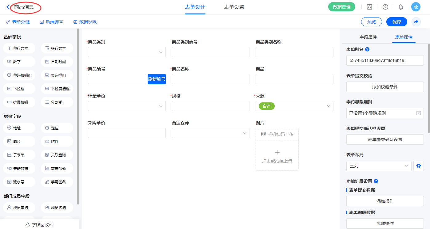 1)【商品类别】字段,选择设置为关联其他表单数据,关联商品类别的【商品类别】字段;