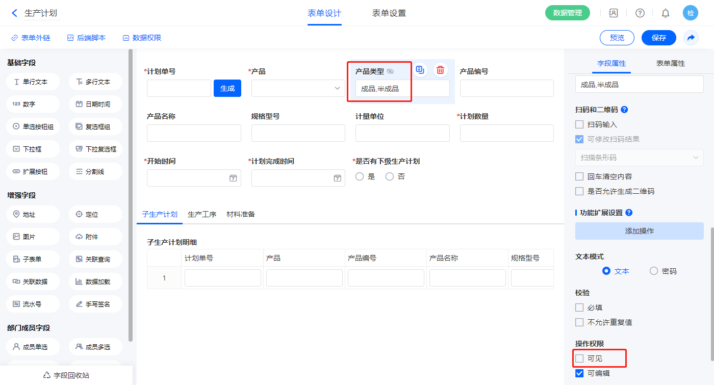 7)表单属性设置显隐规则,当【是否有下级生产计划】字段等于有,显示【标签页.子生产计划】字段;