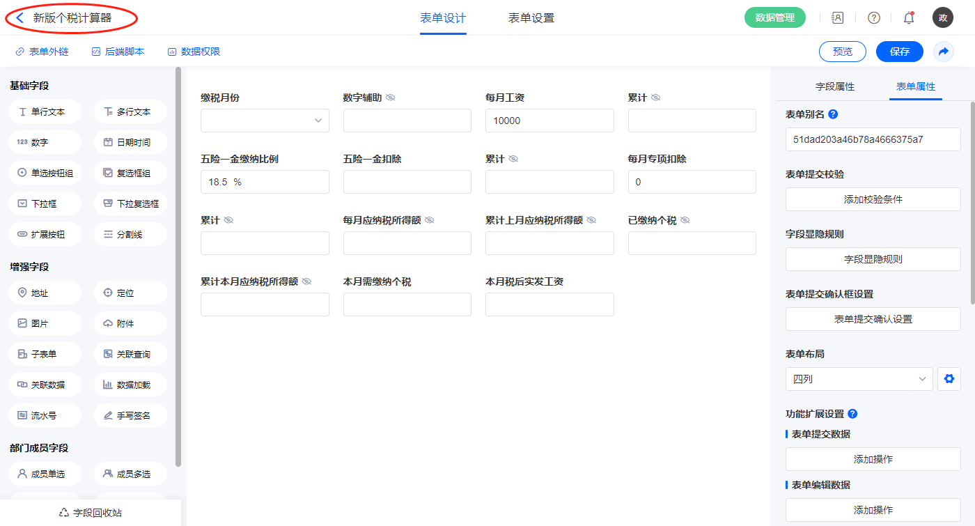 2.3、表单【新版个税计算器】字段及表单属性设置