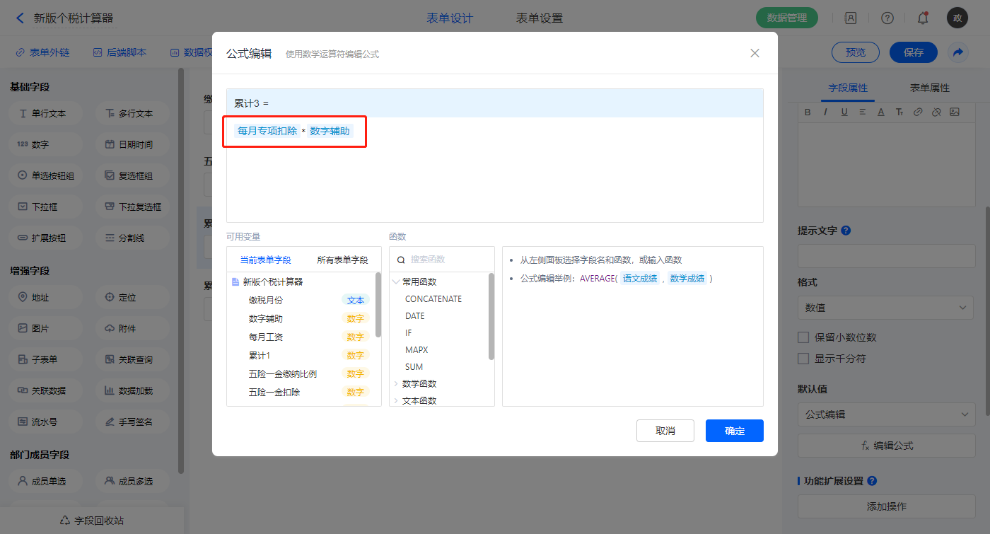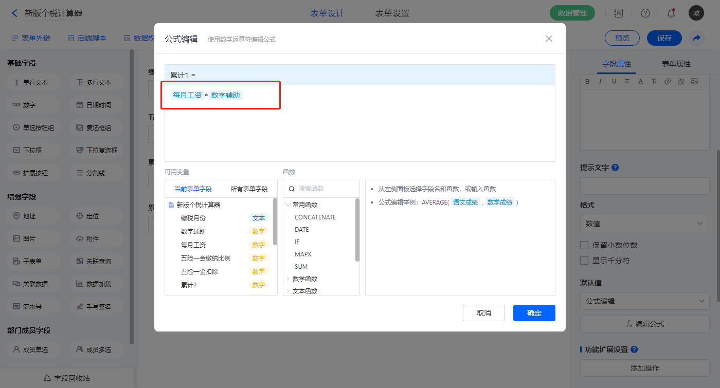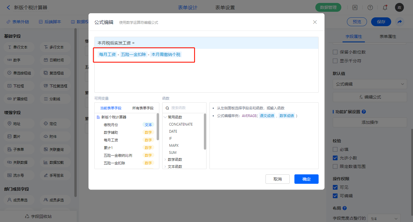 【本月需缴纳个税】字段,默认值选择公式编辑,如图设置公式;