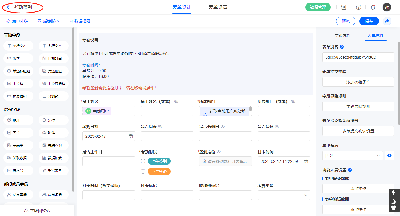 2.2、表单【考勤签到】字段及表单属性设置