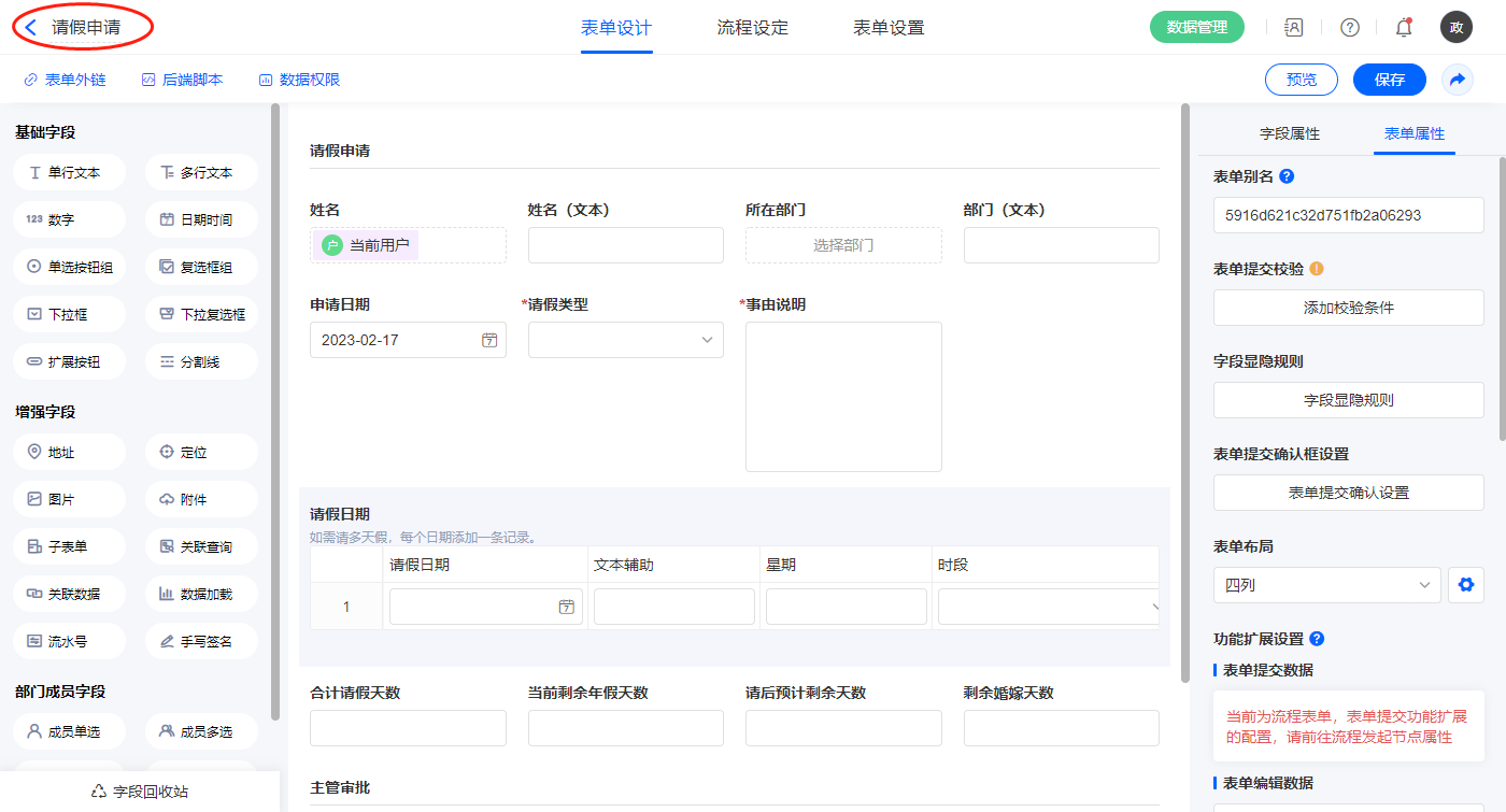 2.3、表单【请假申请】字段及表单属性设置