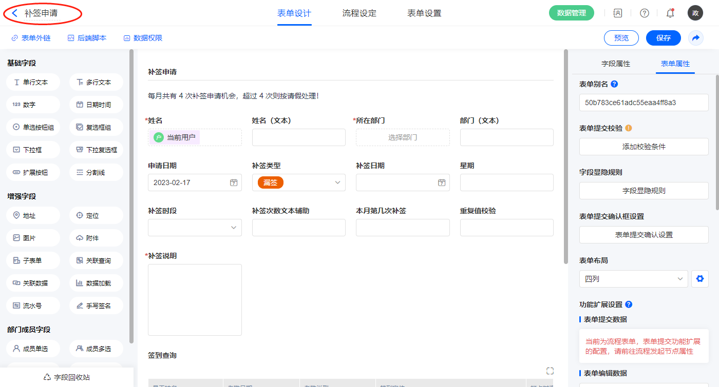 2.4、表单【补签申请】字段及表单属性设置