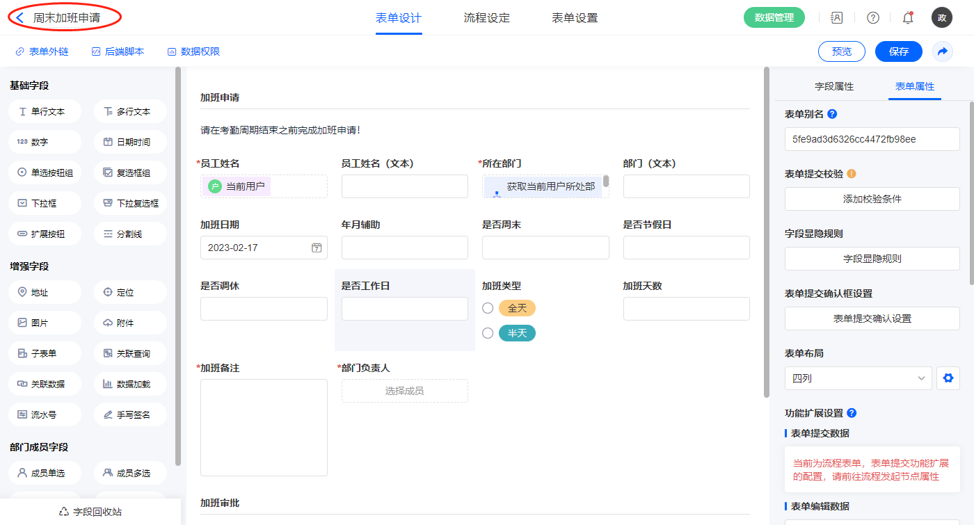 2.5、表单【周末加班申请】字段及表单属性设置