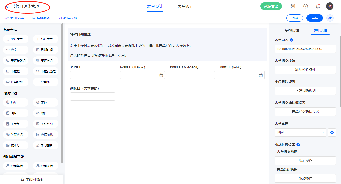 2.6、表单【节假日调休管理】字段及表单属性设置