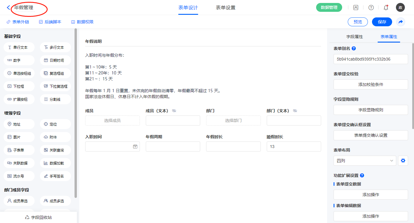 2.8、表单【年假管理】字段及表单属性设置