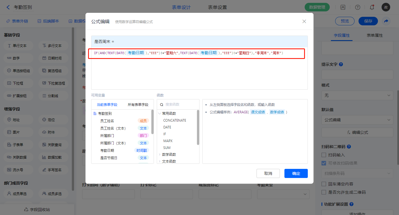 【是否周末】字段,默认值选择公式编辑,如图设置公式;