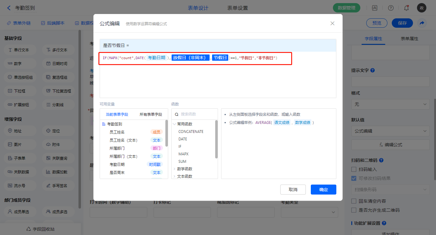 【是否节假日】字段,默认值选择公式编辑,如图设置公式;