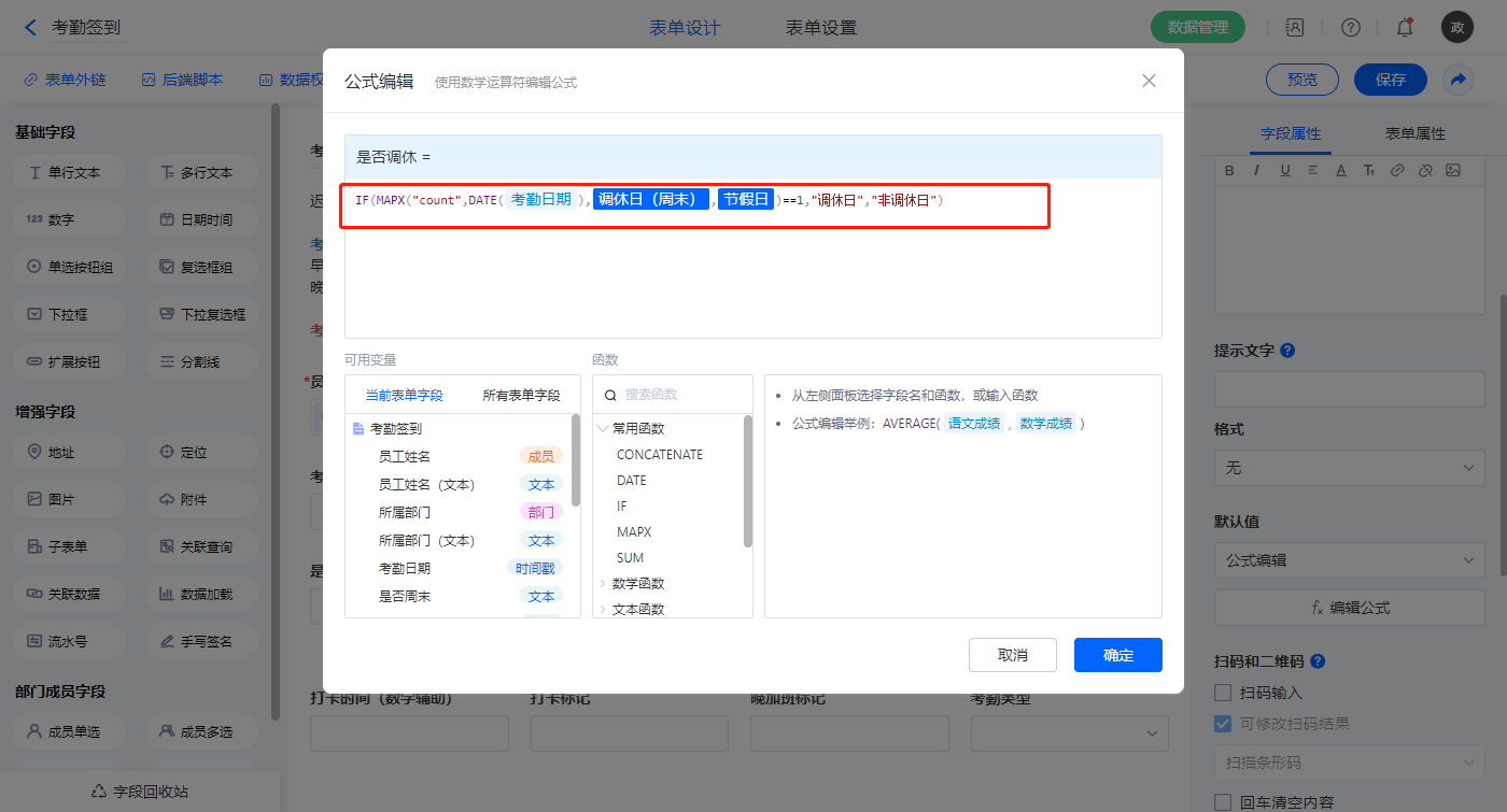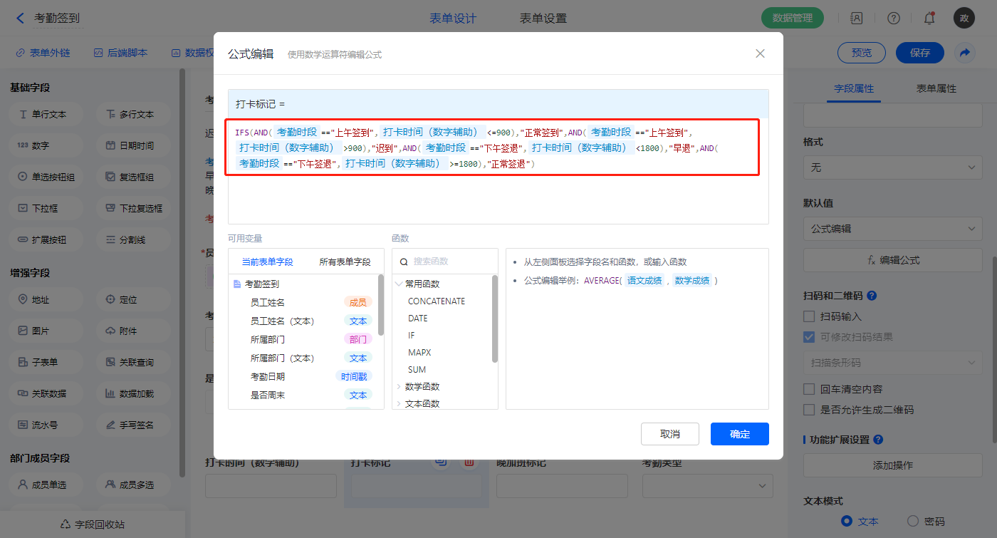 【打卡标记】字段,默认值选择公式编辑,如图设置公式;