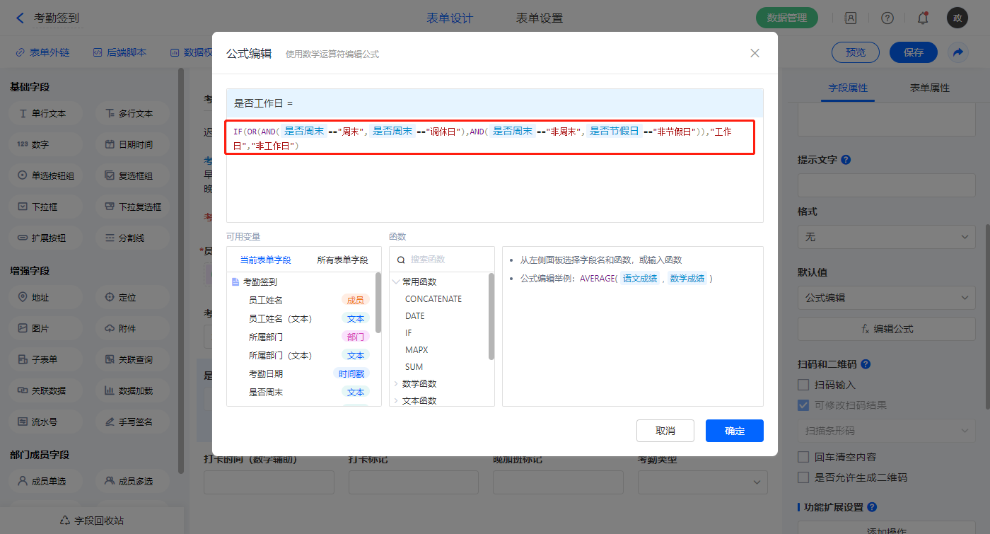 【是否工作日】字段,默认值选择公式编辑,如图设置公式;