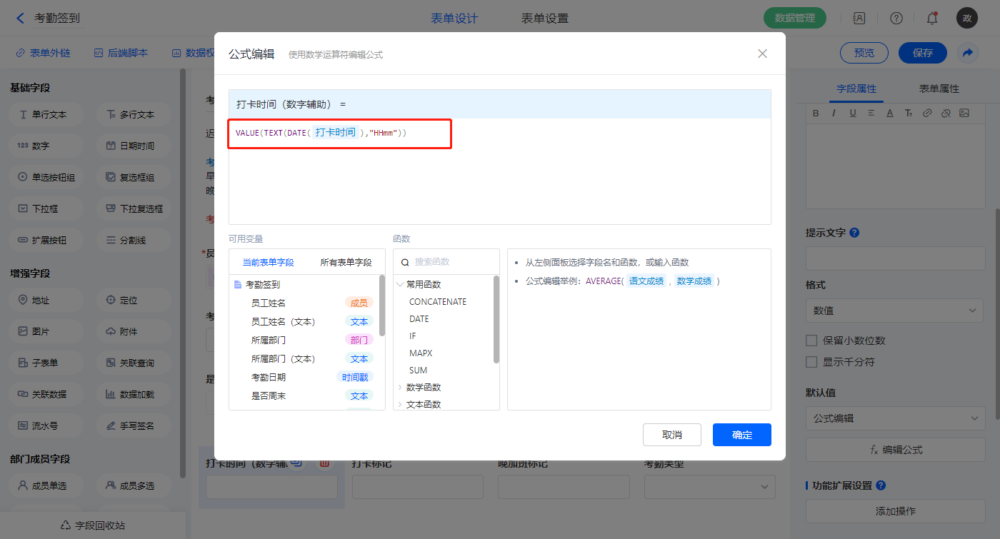 【打卡时间(数字辅助)】字段,默认值选择公式编辑,如图设置公式;