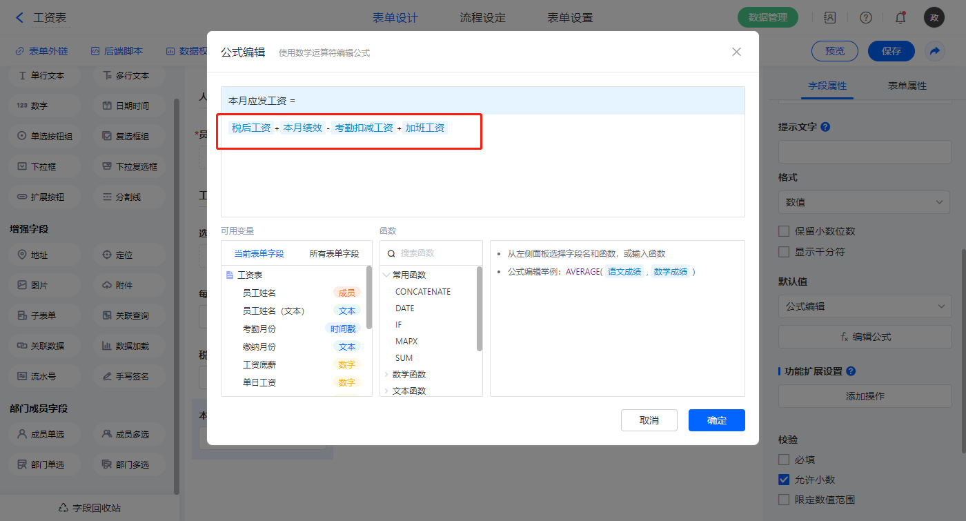 【本月应发工资】字段,默认值选择公式编辑,如图设置公式;