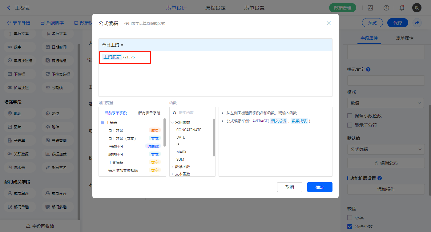 【单日工资】字段,默认值选择公式编辑,如图设置公式;