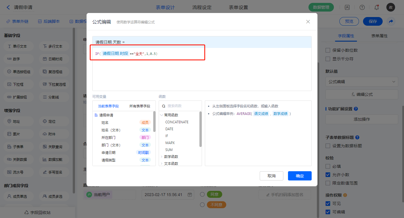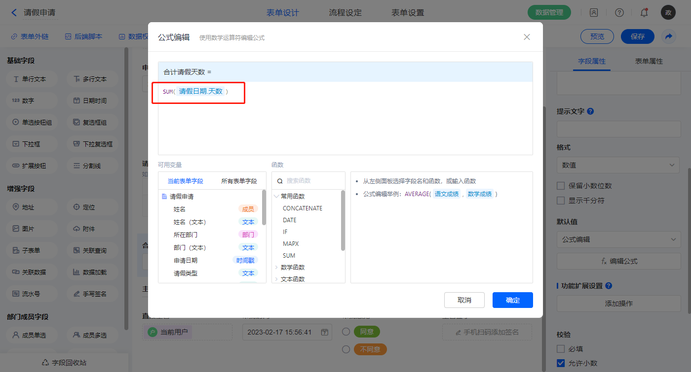 【请假日期.天数】字段,默认值选择公式编辑,如图设置公式;