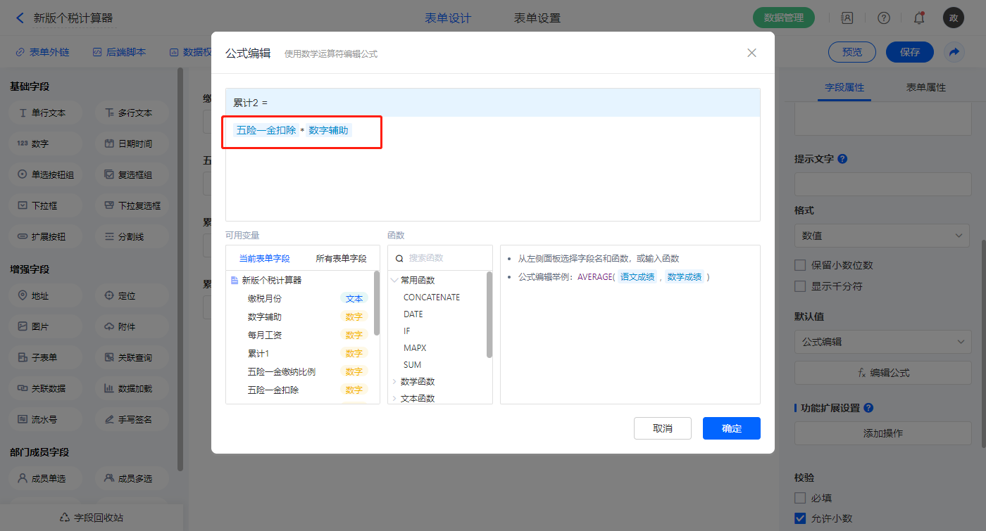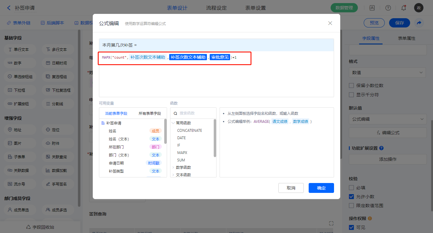 【本月第几次补签】字段,默认值选择公式编辑,如图设置公式;