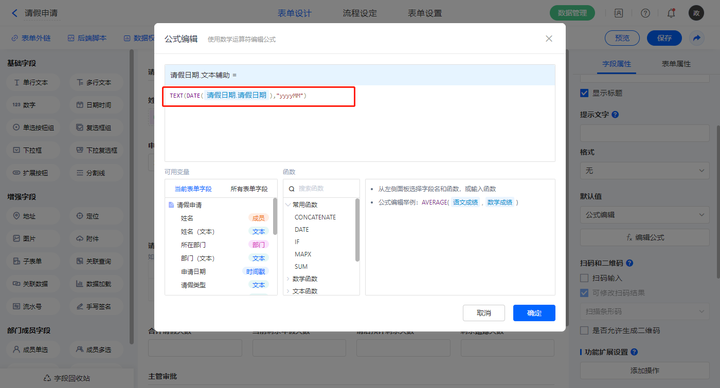 【请假日期.文本辅助】字段,默认值选择公式编辑,如图设置公式;