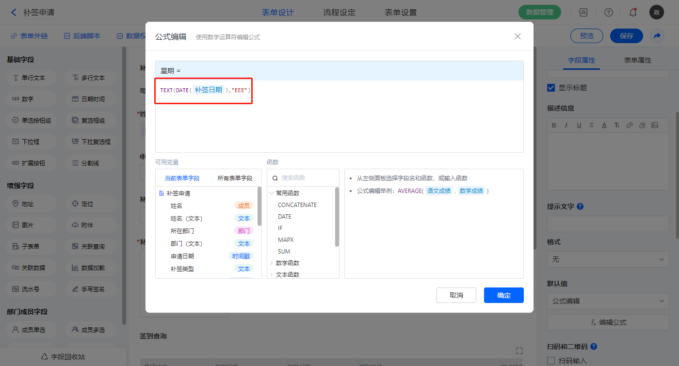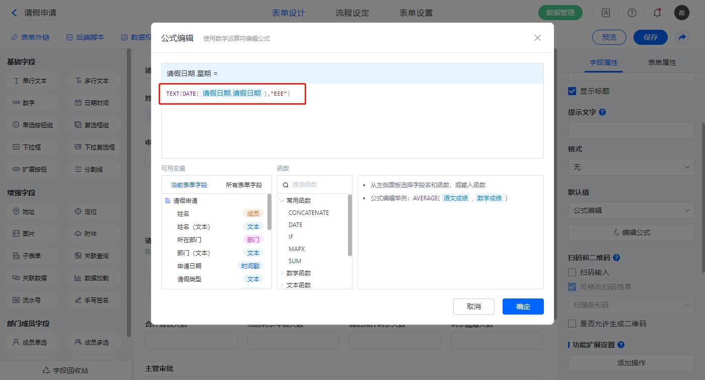 【请假日期.星期】字段,默认值选择公式编辑,如图设置公式;