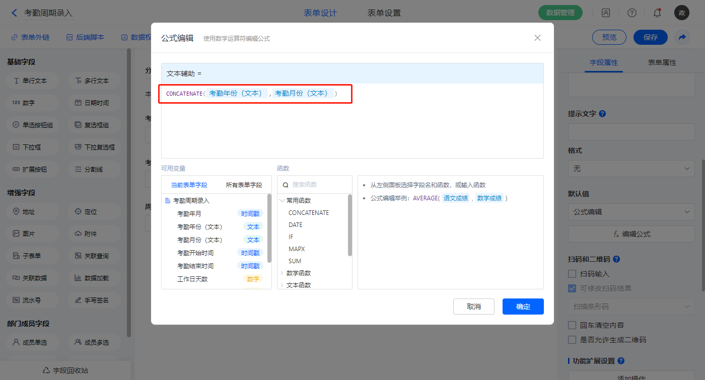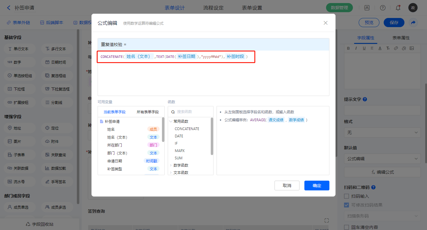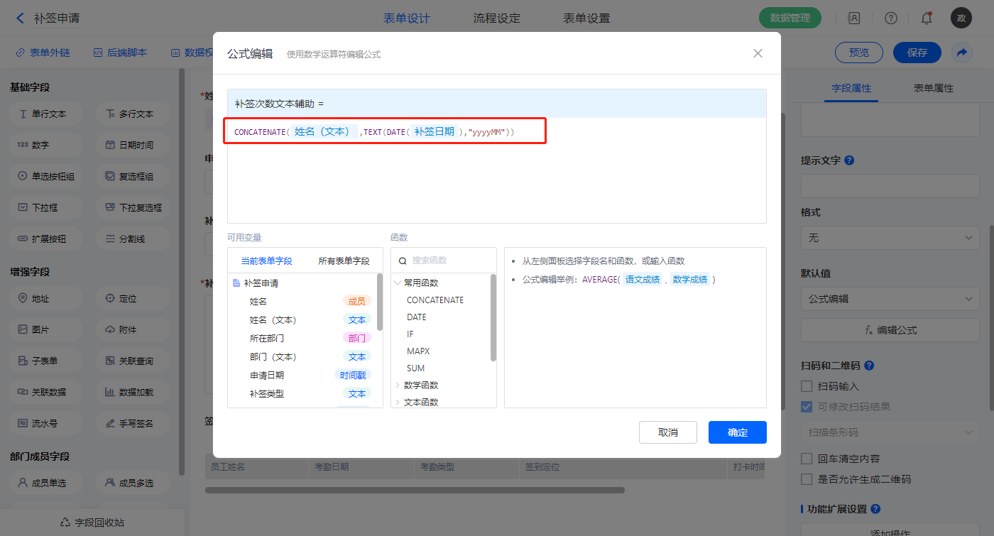 【补签次数文本辅助】字段,默认值选择公式编辑,如图设置公式;