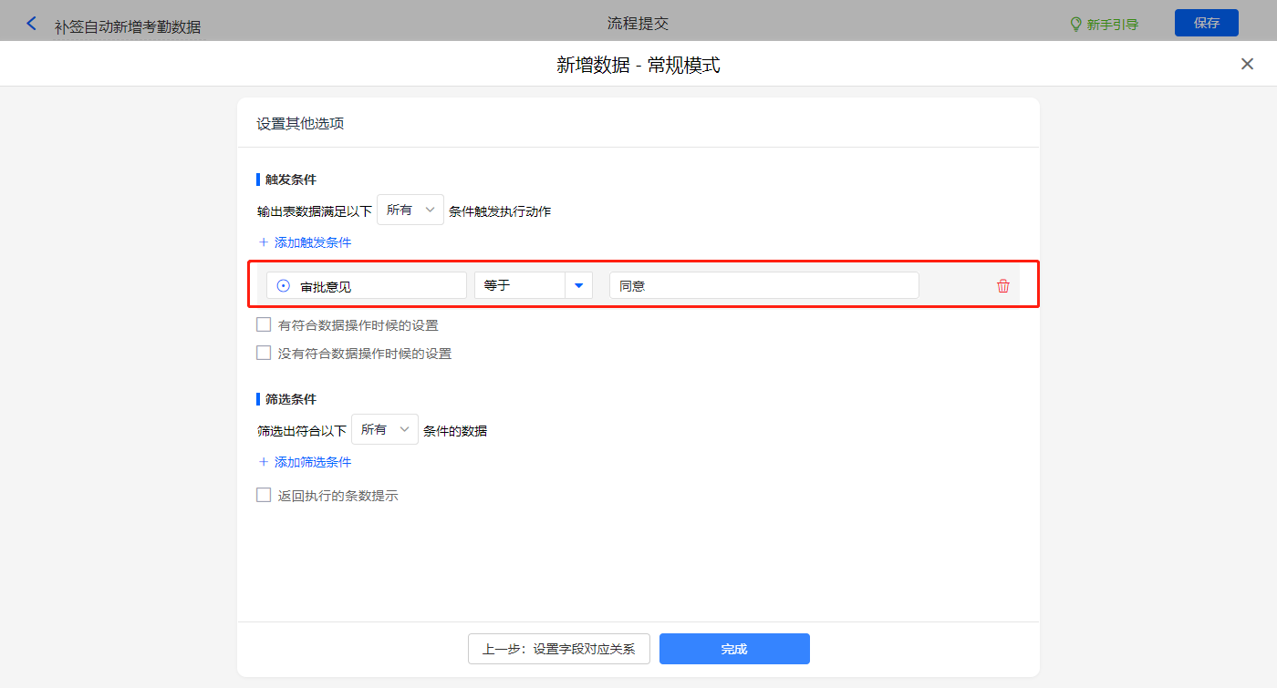 其他设置触发条件为【审批意见】等于同意,设置好点击【完成】并保存该数据助手;