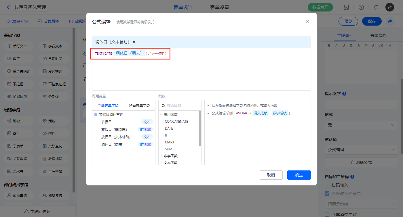 【调休日(文本辅助)】字段,默认值选择公式编辑,如图设置公式;