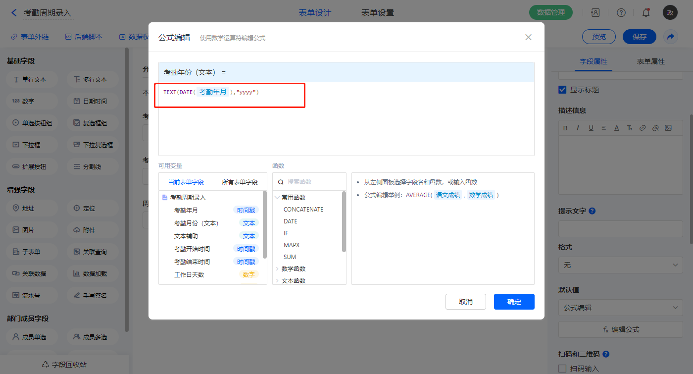 1)【考勤年份(文本)】字段,默认值选择公式编辑,如图设置公式;