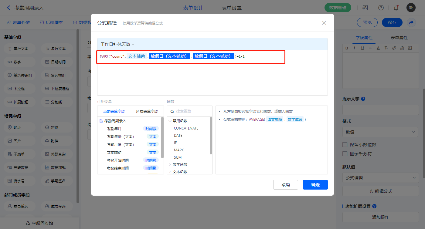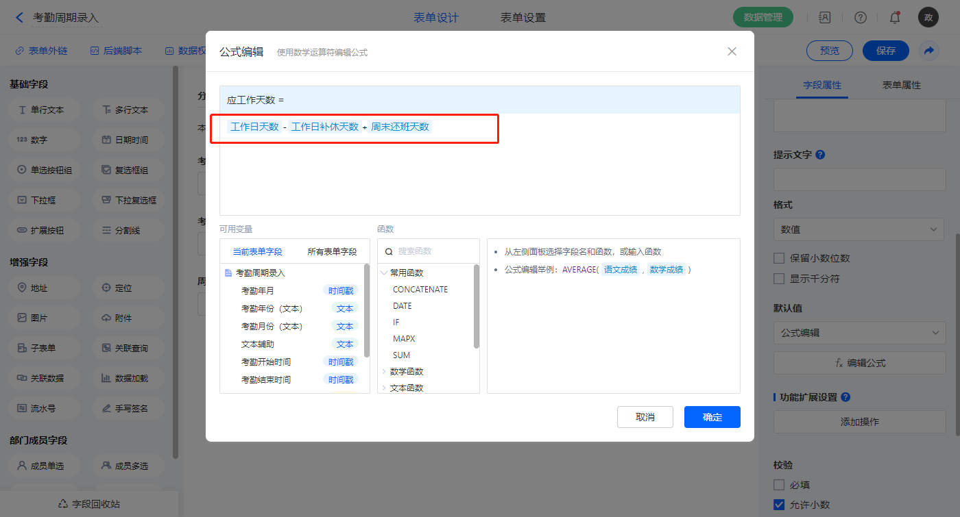 【工作日补休天数】字段,默认值选择公式编辑,如图设置公式;